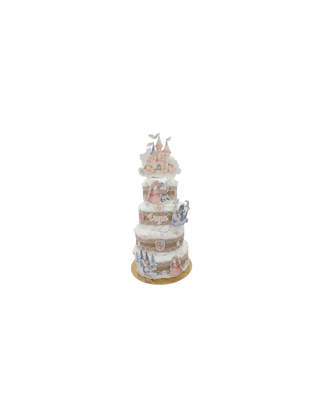 Preciosa tarta de pañales temática de fantasía medieval, diseñada con un estilo suave y tierno, ideal para un regalo de nacimiento o "baby shower"